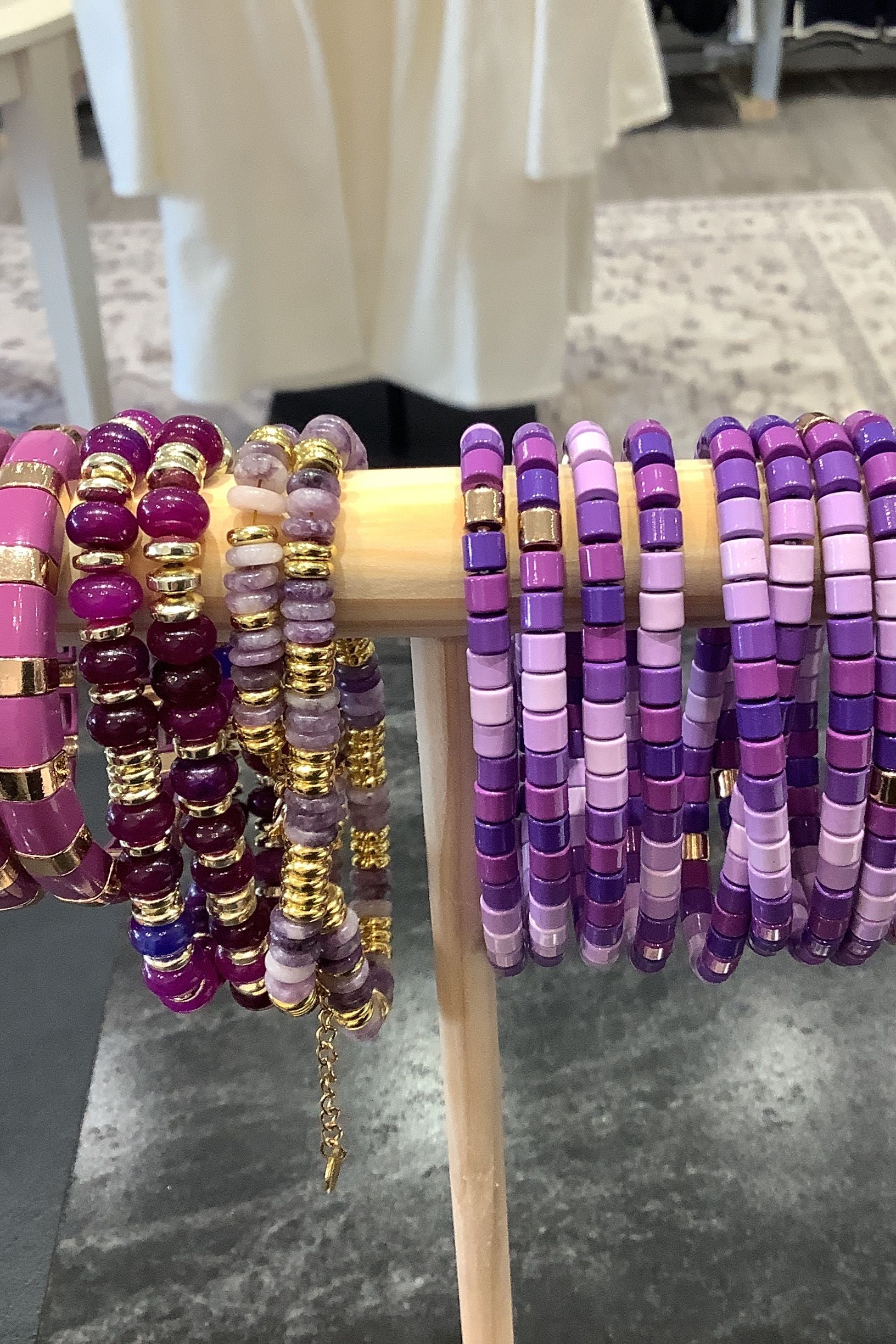 Hand-strung purple beads for a vibrant, textured look