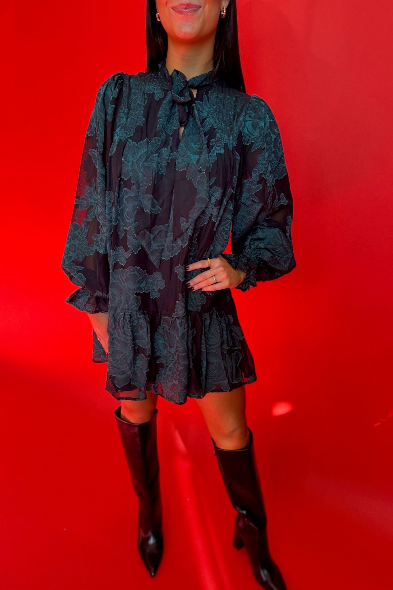 This beautiful long sleeve black and green dress with ruffle cuff and tie would be great for any holiday party!